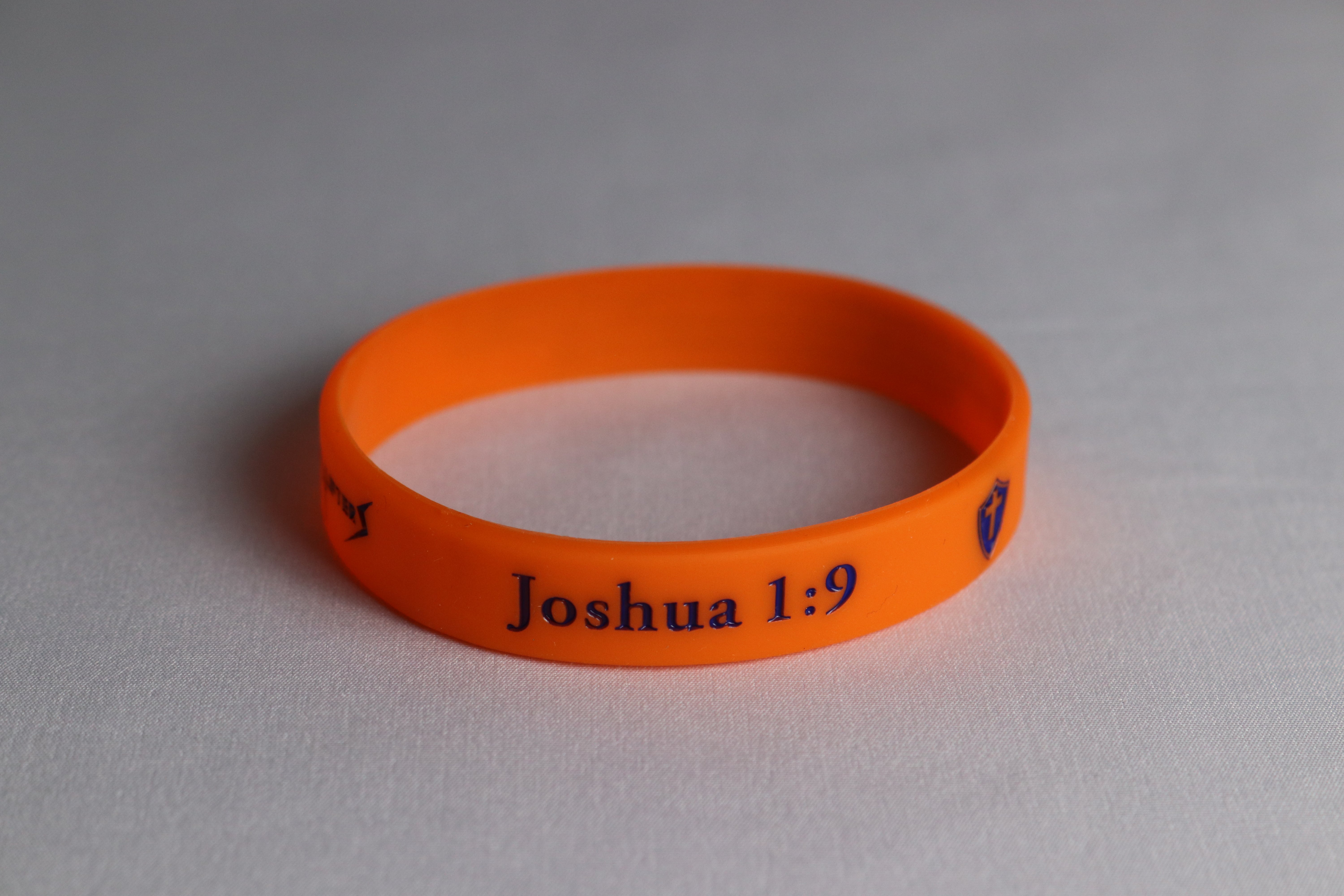 Be courageous and stay reminded of your strength with the Joshua 1:9 wristband. Featuring the powerful bible verse, this orange and blue silicone bracelet serves as a constant reminder to be strong and courageous in any challenge you may face.